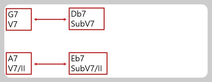 대리도미넌트는 도미넌트에서 증4도관계에 근음을 가지는 도미넌트코드로 대신 사용할수 있습니다.