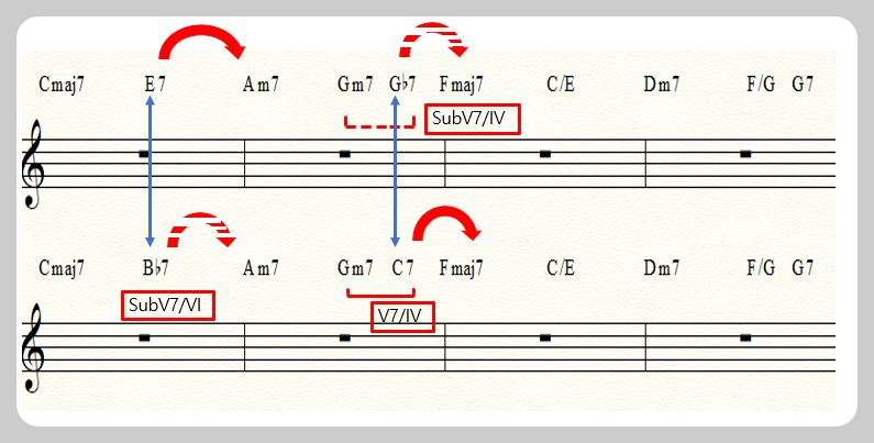 대리도미넌트는 도미넌트에서 증4도관계에 근음을 가지는 도미넌트코드로 대신 사용할수 있습니다.