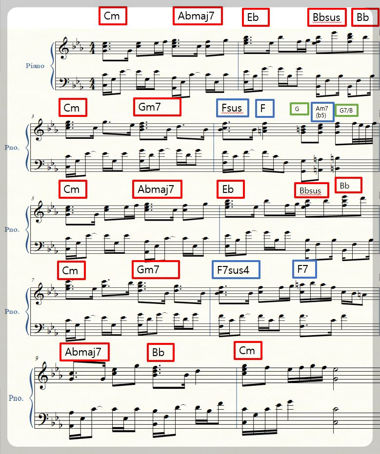 원곡은 Dm 곡인데 이해를 돕기위해 Cm로 트랜스포즈하였습니다.