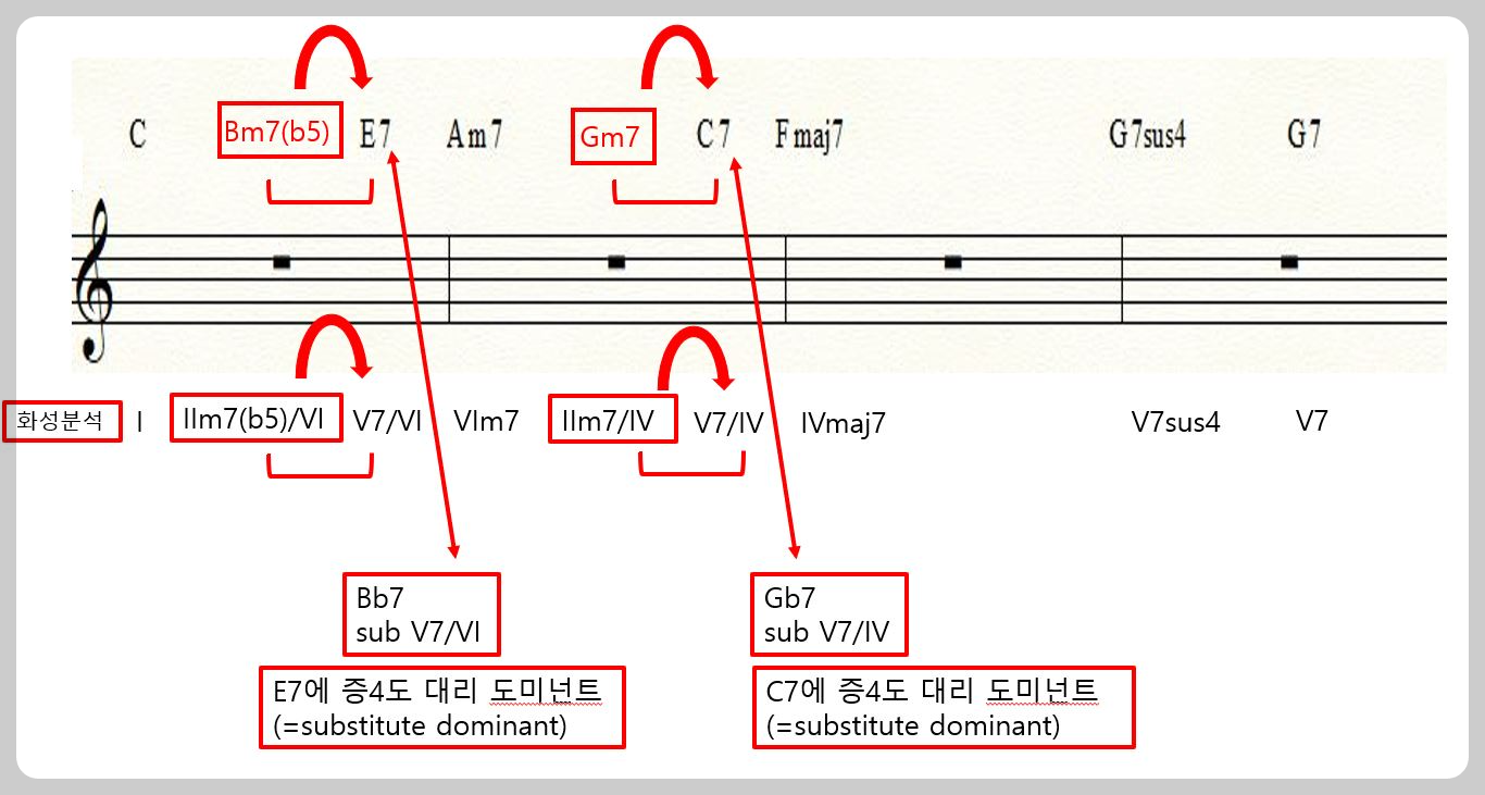 모든 도미넌트 코드는 (ex C7, D7, E7 .....) 그 코드 바로앞에 완전5도위에 음(note)를 근음(root)로 가지는