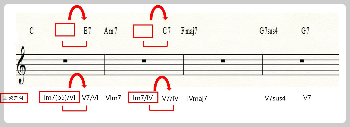 Gm7는 IVmaj7인 Fmaj7의 2도라고 하여 화성분석은 IIm7/IV 라고 합니다.