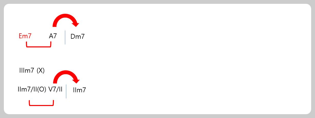 근음으로 가지는 minor 7th chord 즉 Em7(IIm7/II)을 related IIm7으로 사용할 수 있습니다.